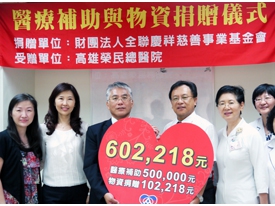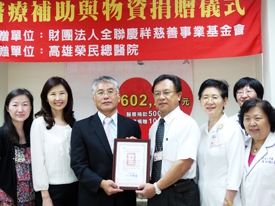 高雄榮民總醫院自79年創立以來,提供南部地區榮民、榮眷及一般民眾最佳之醫療服務與照顧,深獲社會大眾一致好評與肯定,是高屏地區唯一之公立醫學中心,並獲衛生署評定為合格教學醫院,實能感受到該院黃榮慶院長以及醫療團隊的用心,的全聯福利中心及全聯慶祥慈善事業基金會秉持企業社會責任,有感於南部地區貧困病患因負擔不起醫療費用,而無法接受良好照顧,於101年攜手與該院共同照顧弱勢病患,捐贈50萬醫療基金及市值10萬餘元的紙尿布、衛生紙、濕紙巾等物資,使經濟弱勢民眾能安心就醫。