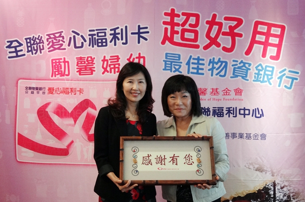 100年5月,全聯福利中心與本會共創的「全聯物資銀行_愛心福利卡」專案,讓弱勢家庭或經濟困難的民眾,就近可至全省全聯分店自主購買本身家庭需要的生活物資,103年起將其專案提升為「全聯物資銀行」愛心福利卡_公益平台,每月儲值金也從原本的500元提高為1,000元,勵馨為感謝與本會邁入第三年合作,每個月提供300張愛心福利卡,共同協助弱勢婦幼,特於四月十日舉辦捐贈儀式。