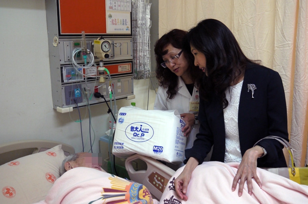 儀式結束後,本會與該院社工員一同至病房關懷受贈病患陳伯伯,陳伯伯患心臟病,其唯一的兒子-阿華(化名) ,罹患精神分裂症,亦於該院治療中,陳伯伯住院期間無人照顧,故聘請看護照料,因伯伯為低收入戶,其看護費用可申請政府補助,惟入院期間的尿布耗材須自行負擔,社工了解困境後提供本會捐贈之尿布給伯伯使用,減輕經濟負擔,張執行長特親自勉勵,使其安心休養。
