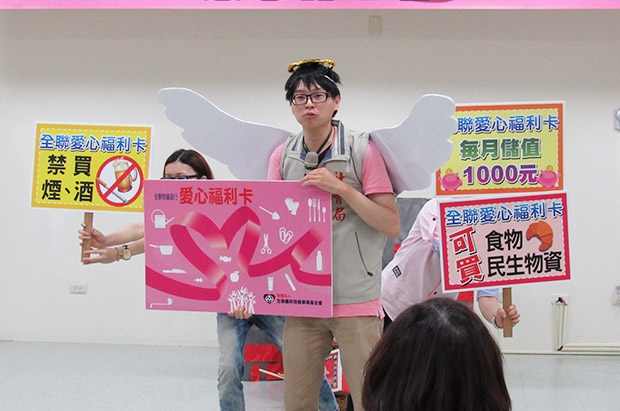 記者會開場,就由市府同仁們表演行動劇,活潑生動地演出再加上裝扮成全聯先生,讓整齣劇充滿著溫暖又笑果十足。台南市政府社會局劉淑惠局長表示,本會創設之「全聯物資銀行_愛心福利卡」專案,不僅打破傳統被動的物資聚集定點未能提供可近性的限制外,也大幅減少社福單位運輸人力之成本,並提升了受助者的自主性及基本生活保障。記者會中,本會張宜君執行長代表捐贈愛心福利卡,並由台南市政府劉淑惠局長親自致贈感謝獎牌,共同期許大台南地區之弱勢家庭能獲得即時、有效的救助!