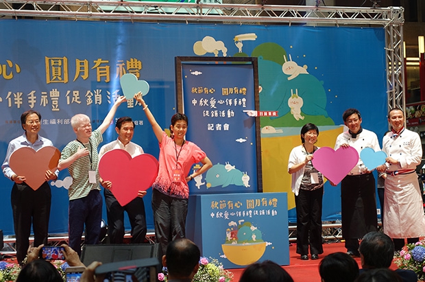 為宣傳活動及感謝贊助之愛心企業與通路,衛生福利部於8/11舉行「2015年秋節產品聯合促銷展售記者會」,由多重障礙舞團「鳥與水舞集」帶來精彩舞碼揭開了序幕,緊接著由視障朋友帶來另一段舞碼,突破生理障礙的精湛演出,在在展現出力與美,讓所有與會者無不動容。兩位站台名人-型男大主廚則於現場示範線上訂購中秋愛心伴手禮,邀請大家一同響應公益活動。
