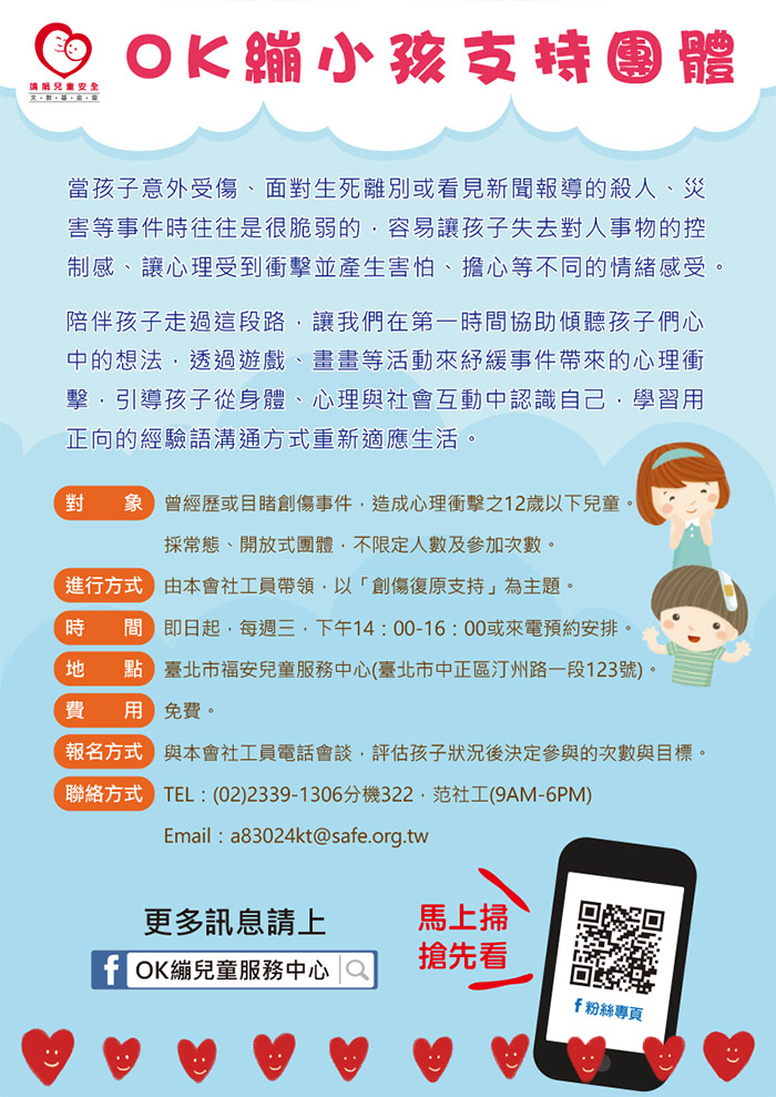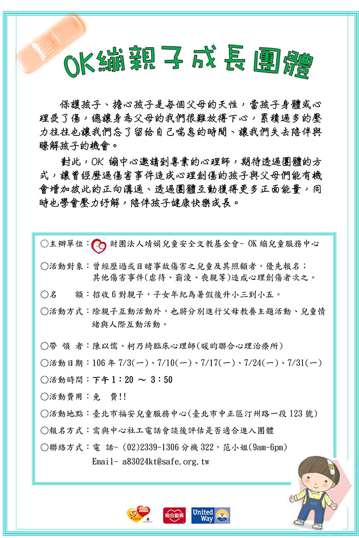 最新消息 活動預告 2017-06-21 歡迎參加>> 靖娟基金會106年【OK繃小孩支持團體】及【親子成長團體】」 靖娟兒童安全文教基金會一直以來致力於推動兒童安全相關事項,而OK兒童服務中心則服務因事故受傷、心理創傷的兒童與家庭,提供心理、法律、醫療的專業服務。近期將辦理以下創傷輔導團體,希望提供家庭及兒童心理輔導服務,歡迎一同來參加喔。 上一則 回總覽 下一則