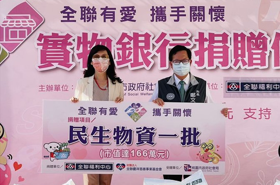 「全聯有愛,攜手關懷」實物銀行物資捐贈儀式。今(23)日下午在桃園區天祥店舉辦,全聯福利中心熱心公益,自106年起開始捐贈桃市安家實物銀行物資,今(111)年再次捐贈友善貼心用品、洗髮精及沐浴乳、成人紙尿褲等民生用品,市值逾166萬元,累計捐贈已超過551萬元,共同守護弱勢家庭。市議員林政賢、陳美梅、黃家齊、市府社會局長鄭貴華、桃園區長洪清淵、全聯慶祥慈善事業基金會執行長張宜君、全聯天祥店經理張欣樺等均一同出席活動。