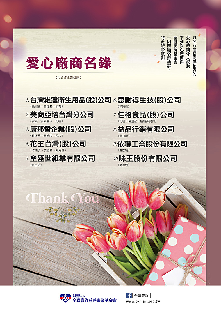 最新消息 公告 2022-12-29 2022年度_感謝愛心廠商 與全聯慶祥基金會齊心照顧弱勢族群 以公益價格提供物資的愛心廠商令人感動, 下列愛心廠商於2022年度與全聯慶祥基金會一同照顧弱勢族群,特此誠摯感謝。 上一則 回總覽 下一則
