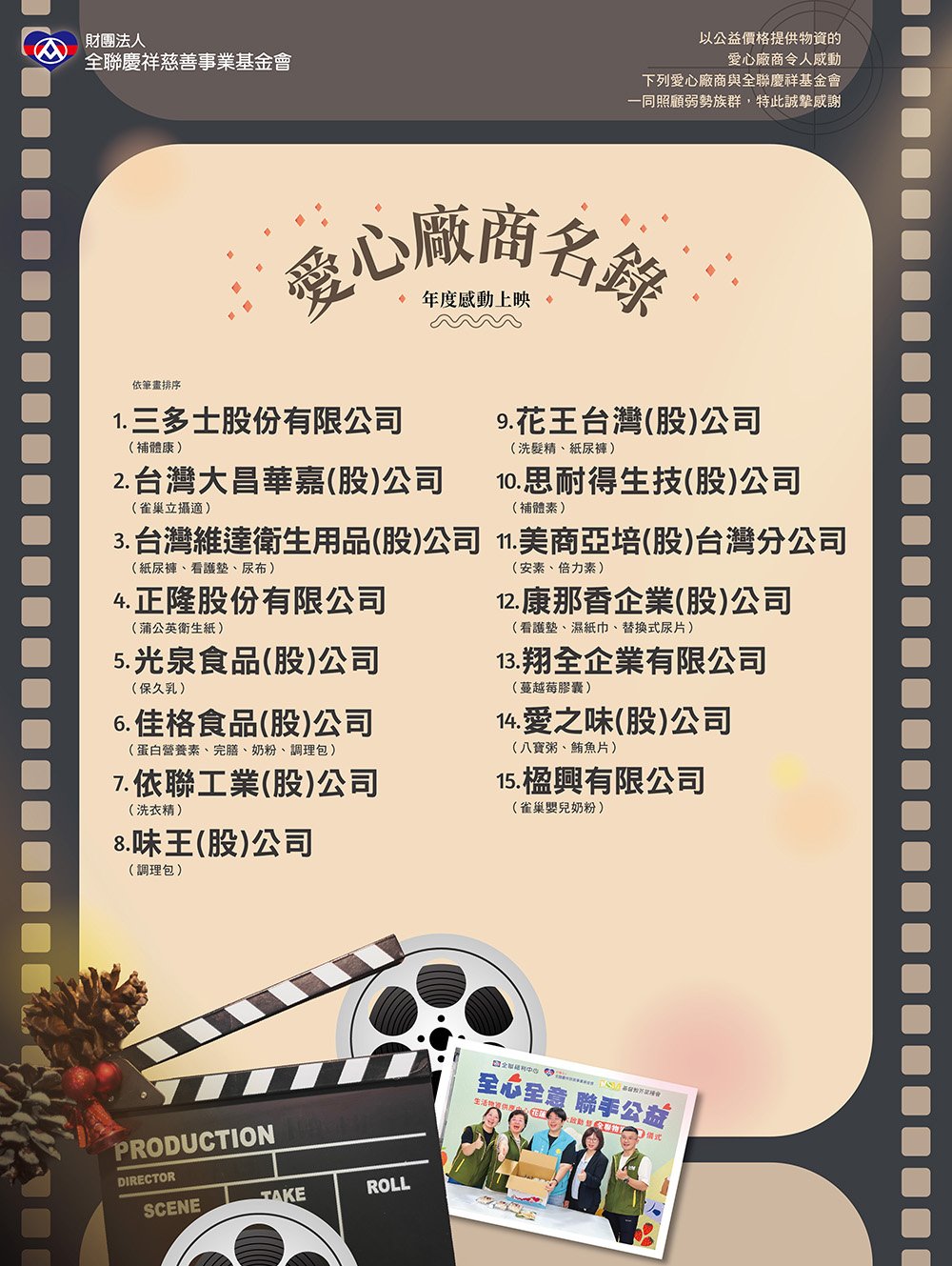 下列愛心廠商於2025年度與全聯慶祥基金會一同照顧弱勢族群,特此誠摯感謝。